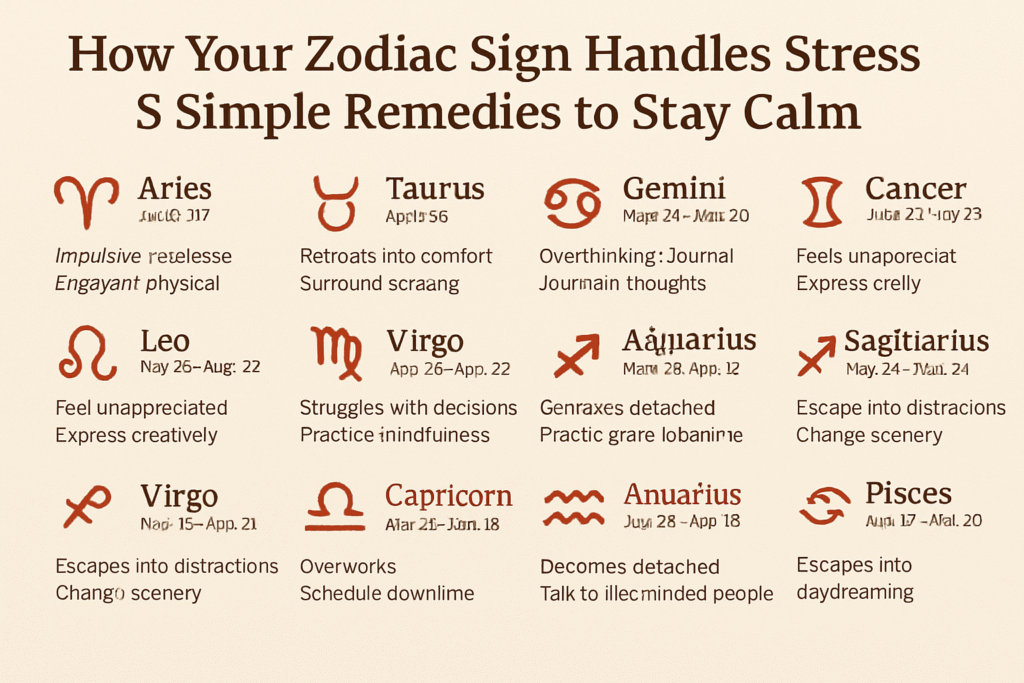 Understanding your zodiac sign’s stress style is not about labeling yourself—it’s about becoming aware of your patterns so you can choose healthier responses. By combining self-awareness with simple remedies, you can navigate life’s challenges with more peace and balance.