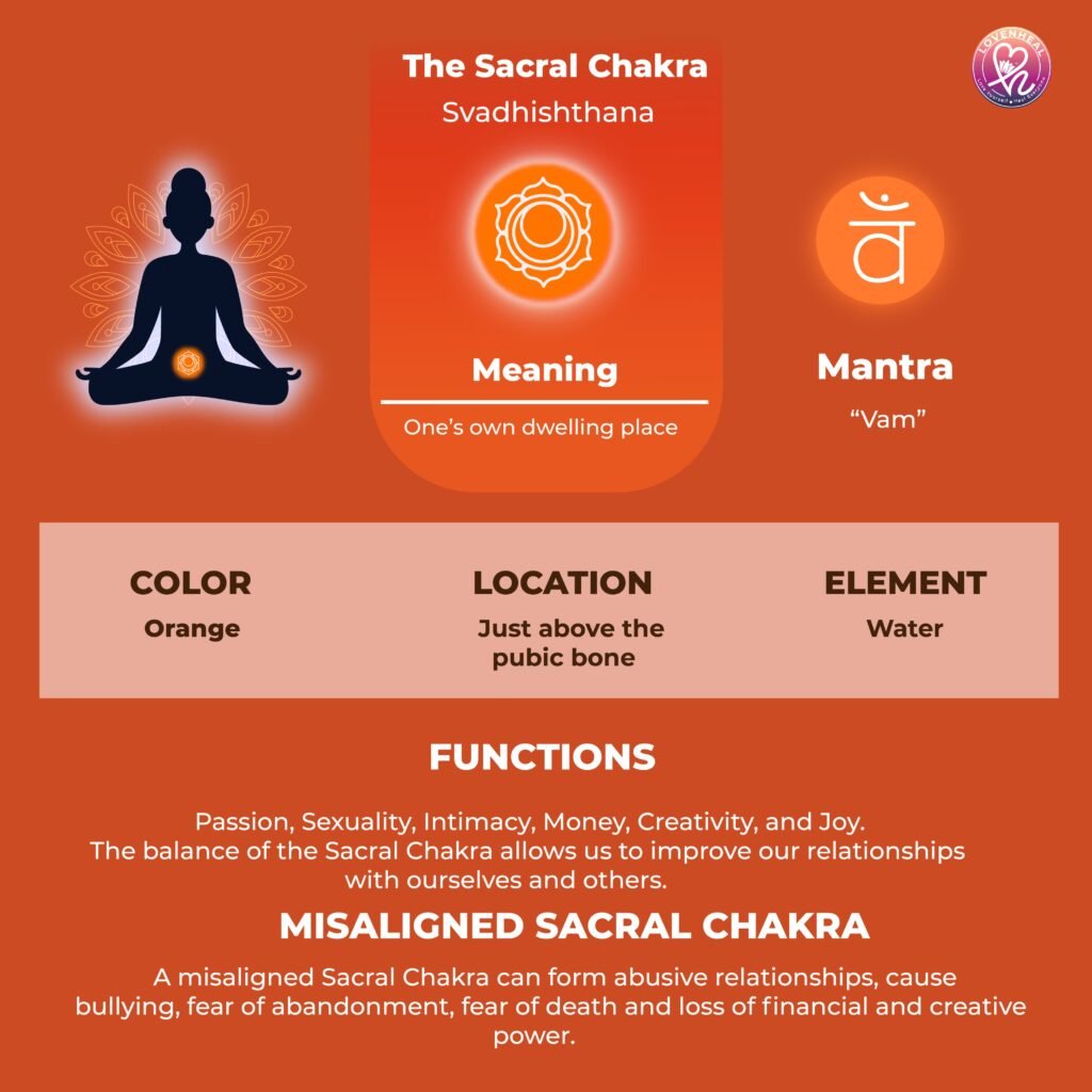 The sacral chakra, also known as Svadhisthana in Sanskrit, is the second of the seven primary chakras aligned along the spine. It is located approximately two inches below the navel, in the pelvic region. This energy center is associated with our emotions, creativity, pleasure, and reproductive system.